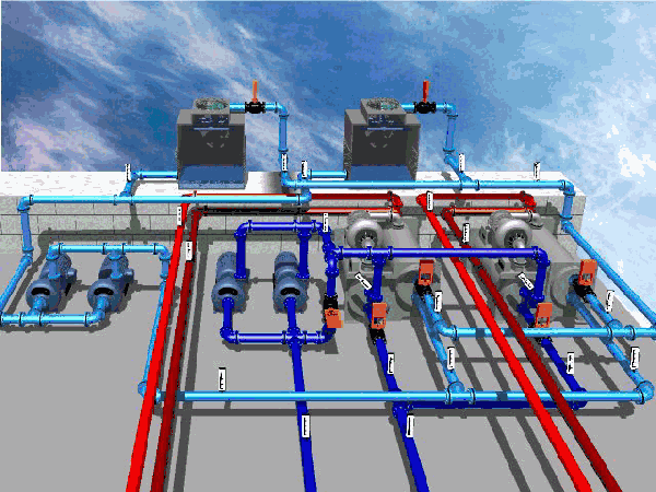 這是中央空調(diào)的“制冷源”,“心藏”,通往各個房間循環(huán)水由冷水機組進行“內(nèi)部交換”,降溫為“冷卻水”。