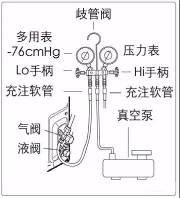 (3)完全打開(kāi)歧管閥Lo(低壓)手柄,開(kāi)動(dòng)真空泵抽真空。