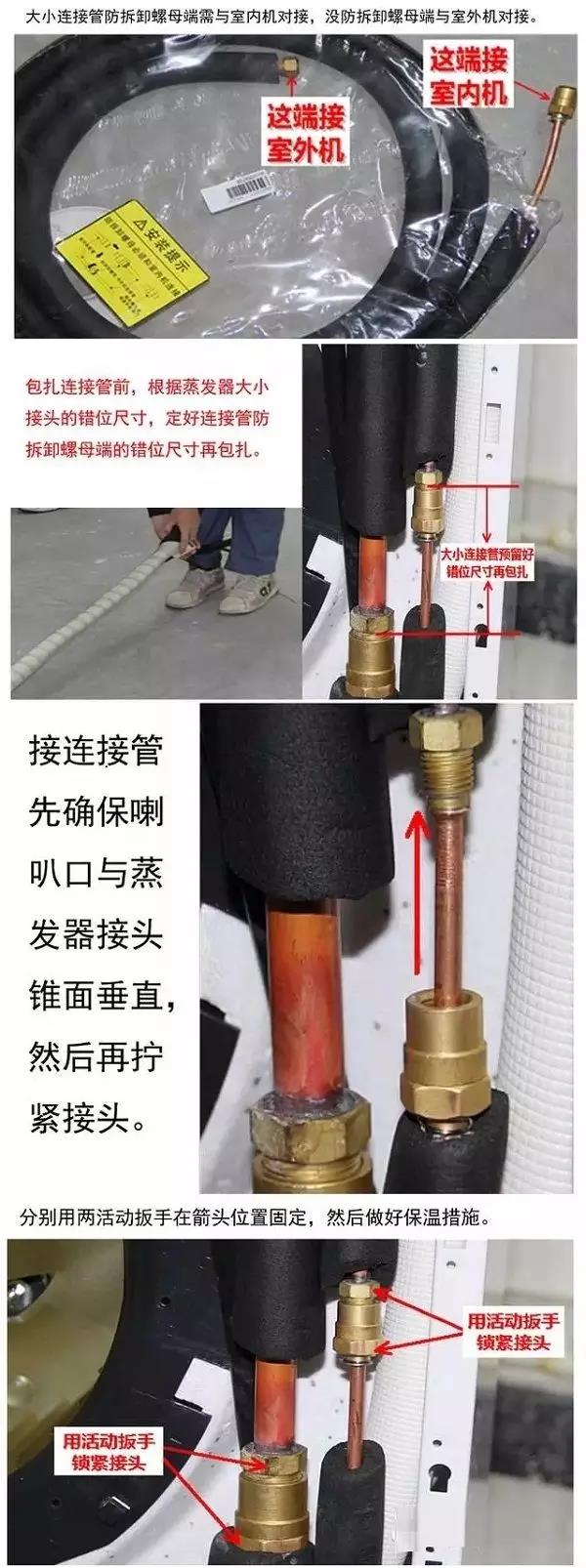 1)將連接管穿入室內(nèi)機(jī)對(duì)接,用扳手緊固大小連接管。