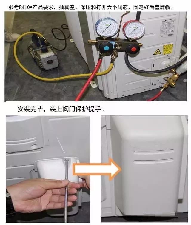 參考R410A產(chǎn)品要求,抽真空、保壓和打開(kāi)大小閥芯、固定好后蓋螺帽。嚴(yán)禁采用機(jī)內(nèi)冷媒排空!具體抽空步驟如下: