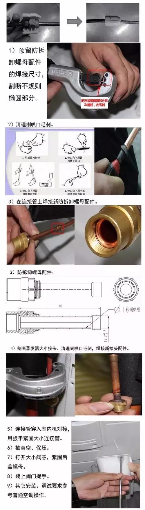 由于室內(nèi)側(cè)連接管外安裝有不可拆卸的防拆帽,所以當(dāng)涉及室內(nèi)機(jī)系統(tǒng)需要返回專業(yè)網(wǎng)點(diǎn)維修時(shí),必須破壞防拆帽,操作要求如下: